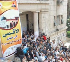 Al-Aqsa in danger: Egyptian lawyers protesting against the Israeli violations against Al-Aqsa Mosque outside the Bar Association in downtown Cairo Monday. Tight security measures barred photographers from taking photos of protests at Cairo University.