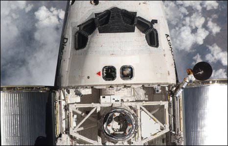 Discovery and its crew of seven are due to land at Florida's Kennedy Space Center on Monday.