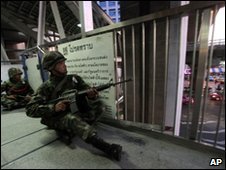 The Thai army has moved hundreds of soldiers into the business district of Bangkok to prevent anti-government protesters entering the area.The protests by the "red-shirts", now in their fifth week, are currently focused in the city's shopping hub.