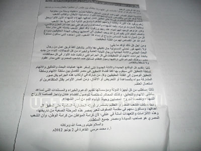 Mohammed Morsy, presidential candidate of Muslim Brotherhood has issued an announcement which was distributed in Beni Suef in which he promised a retrial for Mubarak and his assistances if he wins in the run-off on june 16 and 17.