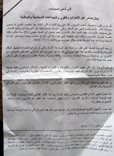 Many parties and political forces in Suez have issued a statement in which it denounced killing university student Ahmed Husein Eid by 3 bearded white-dressed men who stabbed him with a sharp knife (as he was walking with his fiancee alone!) which later has resulted in his death at hospital .The statement has demanded al-Azhar as well as the president to do something against such terroristic thinking and behavior.