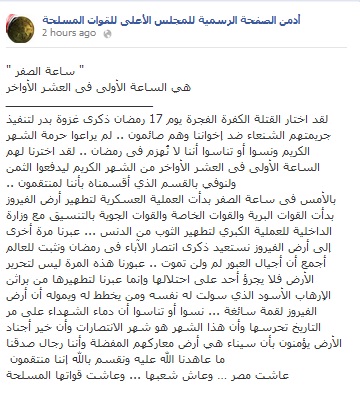 The official page of the Armed Forces on Facebook has issued a statement today in which it said: We took revenge as we had promised from the killers of our brethren in the terroristic attack in Sinai.
