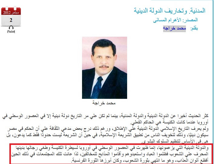 In the latest article of the new Editor-in-Chief of the official Al-Ahram Massai, Mohammad Kharaga has included unjustified insults against Christianity in his article claiming Christianity is but an impure religion.