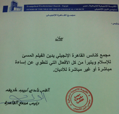 Cairo Evangelical Synod has issued a statement today, in which it condemned the anti-Islam movie as well as any movies that include defamation of religions.