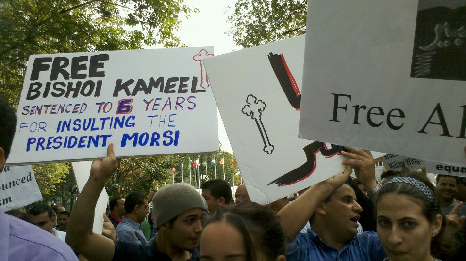 About 1000 Copts have demonstrated in front of the UN building in New York, against President Muhammad Morsy denouncing the judgments against Albier Saber and Bishoy Kamiel.
