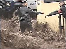 Television pictures showed muddy torrents coursing down narrow channels and spilling over the sides, roads awash with water and streets littered with debris.